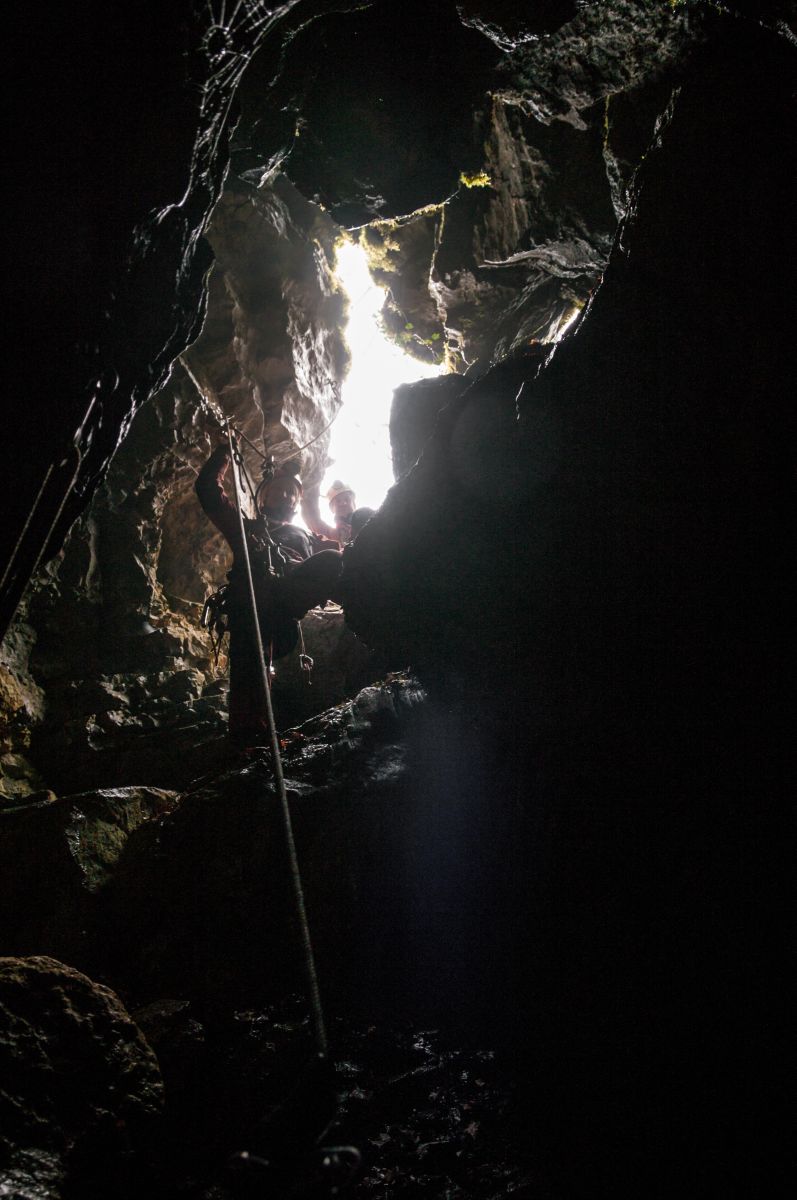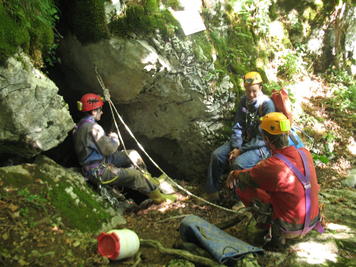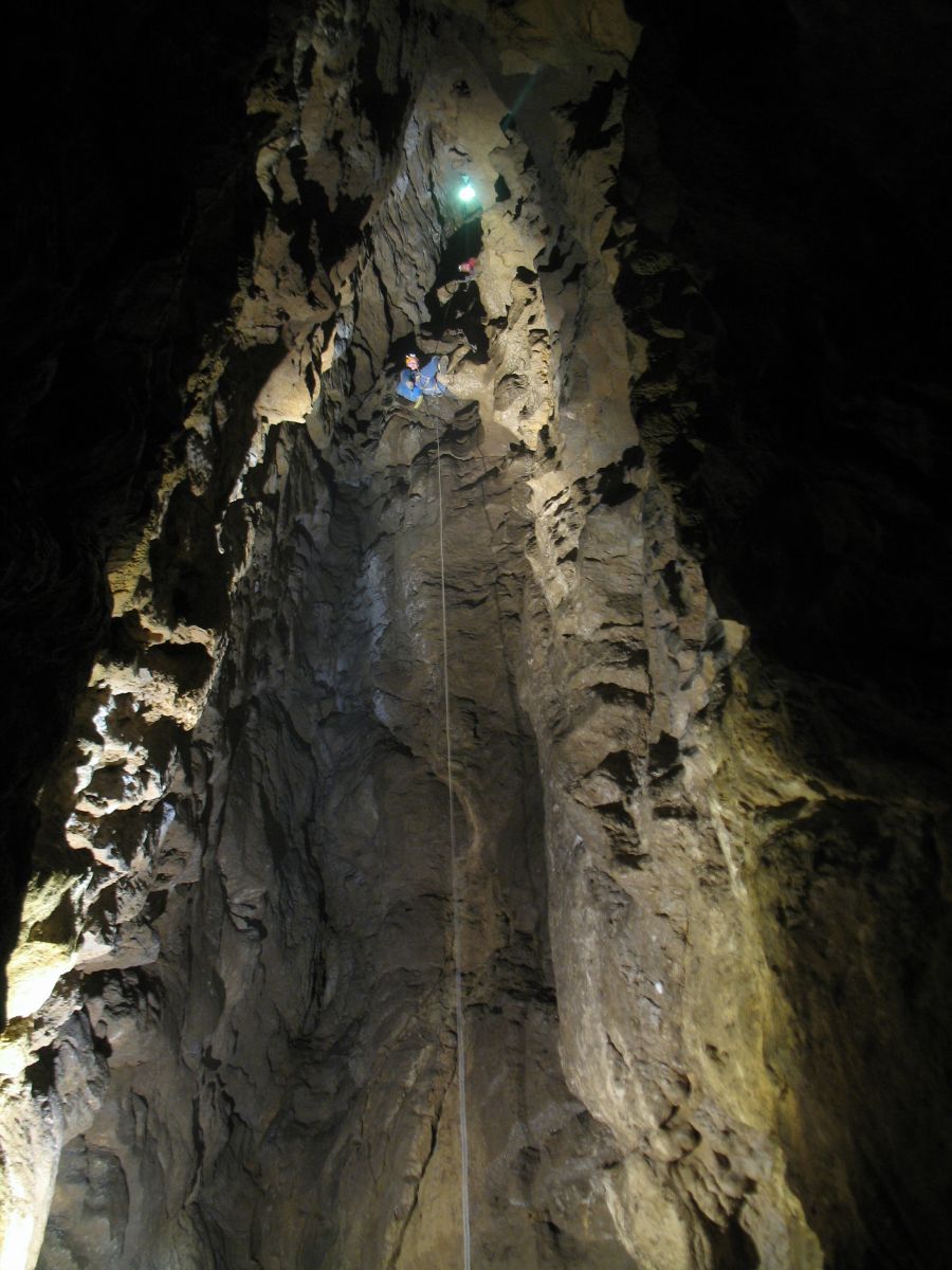 Der Gouffre de Vau besteht aus einem 44 Meter tiefen Eingangsschacht und einem wunderschönen Horizontalgang. Am Schachtgrund trifft man normalerweise auf einige Feuersalamander und man muss gut aufpassen, wo man hintritt. Der sich anschließende Gang ist reich geschmückt und man findet vor allem sehr schöne Sinterfahnen aber auch alle andern gängigen Sinterformen. Im hinteren Bereich setzt dann noch eine Schachtfolge ein. Wir sind die ersten beiden Schächte abgeseilt und hatten dann nicht mehr genügend Seile dabei, um noch weiter vorzudringen. Zu bemerken ist jedenfalls, dass mit den Schächten die Schönheit der Höhle schlagartig aufhört und man in lehmige, ungeschmückte Passagen gelangt. Die untere Etage soll extrem verlehmt sein.