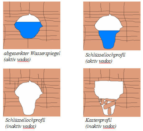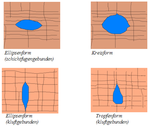 Die Gangformen sind also zuerst einmal in Klüften oder Schichtfugen angelegt und nehmen, wenn das saure Wasser die Gänge erweitert vor allem nachstehende Gangformen an: